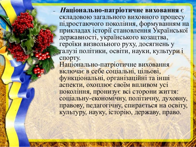 Національно-патріотичне виховання дітей та молоді – це комплексна системна і цілеспрямована діяльність органів державної влади, громадських організацій, сім’ї, освітніх закладів, інших соціальних інститутів щодо формування у молодого покоління високої патріотичної свідомості, почуття вірності, любові до Батьківщини, турботи про благо свого народу, готовності до виконання громадянського і конституційного обов’язку із захисту національних інтересів, цілісності, незалежності України, сприяння становленню її як правової, демократичної, соціальної держави. Найважливішим пріоритетом національно-патріотичного виховання є формування ціннісного ставлення особистості до українського народу, Батьківщини, держави, нації.