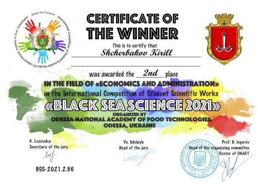 Вітаємо студента 1 курсу магістратури спеціальності обліку і оподаткування Кирила Щербакова з отриманням диплому ІІ ступеня на Міжнародному конкурсі студентських наукових робіт «Black Sea Science».