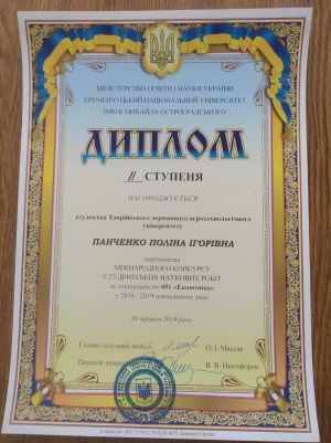 За підсумками роботи секції «Економіка» Ольга Назарова та Наталя Дьоміна підготували переможця конкурсу. Ним стала Поліна Панченко, яка отримала диплом ІІ ступеня. Наукові керівники призера щиро вдячні Вікторії Булановій – студентці 11 ПТ групи за допомогу у підготовці докладу англійською мовою.