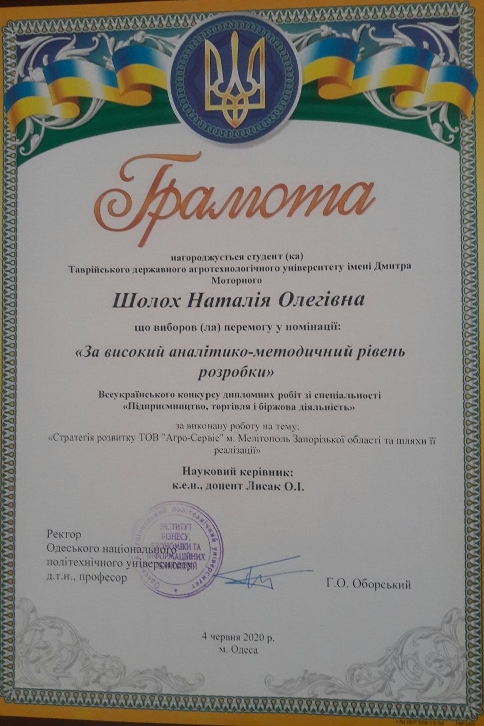 Перемоги кафедри «Підприємництво, торгівля та біржова діяльність» ТДАТУ у Всеукраїнському конкурсі дипломних робіт