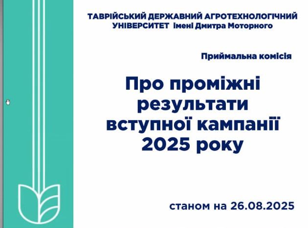 Відповідальний секретар приймальної комісії Іван Чижиков та директори ВСП доповідали про проміжні результати основної сесії вступної кампанії 2025. Завдяки злагодженій роботі, в цьому році на денну форму навчання освітнього ступеня бакалавра до ТДАТУ було зараховано 1222 особи. За результатами набору вступників, університет посів друге місце в області (після ЗНУ), 2 місце серед аграрних ЗВО (після НУБіП) та перше місце серед релокованих ЗВО.