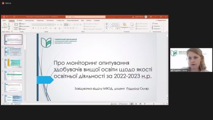 З першого питання виступала завідувач відділу моніторингу якості освіти ТДАТУ Радміла Скляр, яка ознайомила членів НМР із результатами опитування здобувачів вищої освіти щодо якості освітньої діяльності у 2022-2023 н.р. Було наголошено, що оцінювання стосувалось якості освітніх програм, якості викладання й навчання та окремо проводилось опитування саме випускників бакалаврату. Було проаналізовано позитивні й негативні аспекти, визначено подальші кроки з удосконалення програм навчання та освітнього процесу.