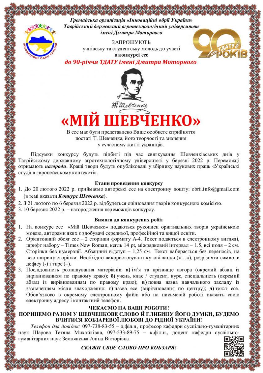 Днями підбито підсумки конкурсу есе учнівської та студентської молоді “Мій Шевченко”, співорганізаторами якого були ГО “Інноваційні обрії України” і Таврійський державний агротехнологічний університет імені Дмитра Моторного.