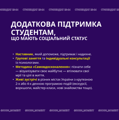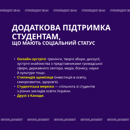 Звертаємося до вас з проханням активно підтримати поширення інформації про новий набір на освітню програму “Стипендіат 2023-2024” серед студентів, які мають один із соціальних статусів: