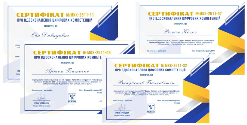 Після проходження підсумкового тестування студенти отримали сертифікати, що підтверджують підвищення їх цифрової грамотності та вміння ефективно працювати з сервісом і застосовувати його в навчальній діяльності, профорієнтаційних проєктах і командній роботі.