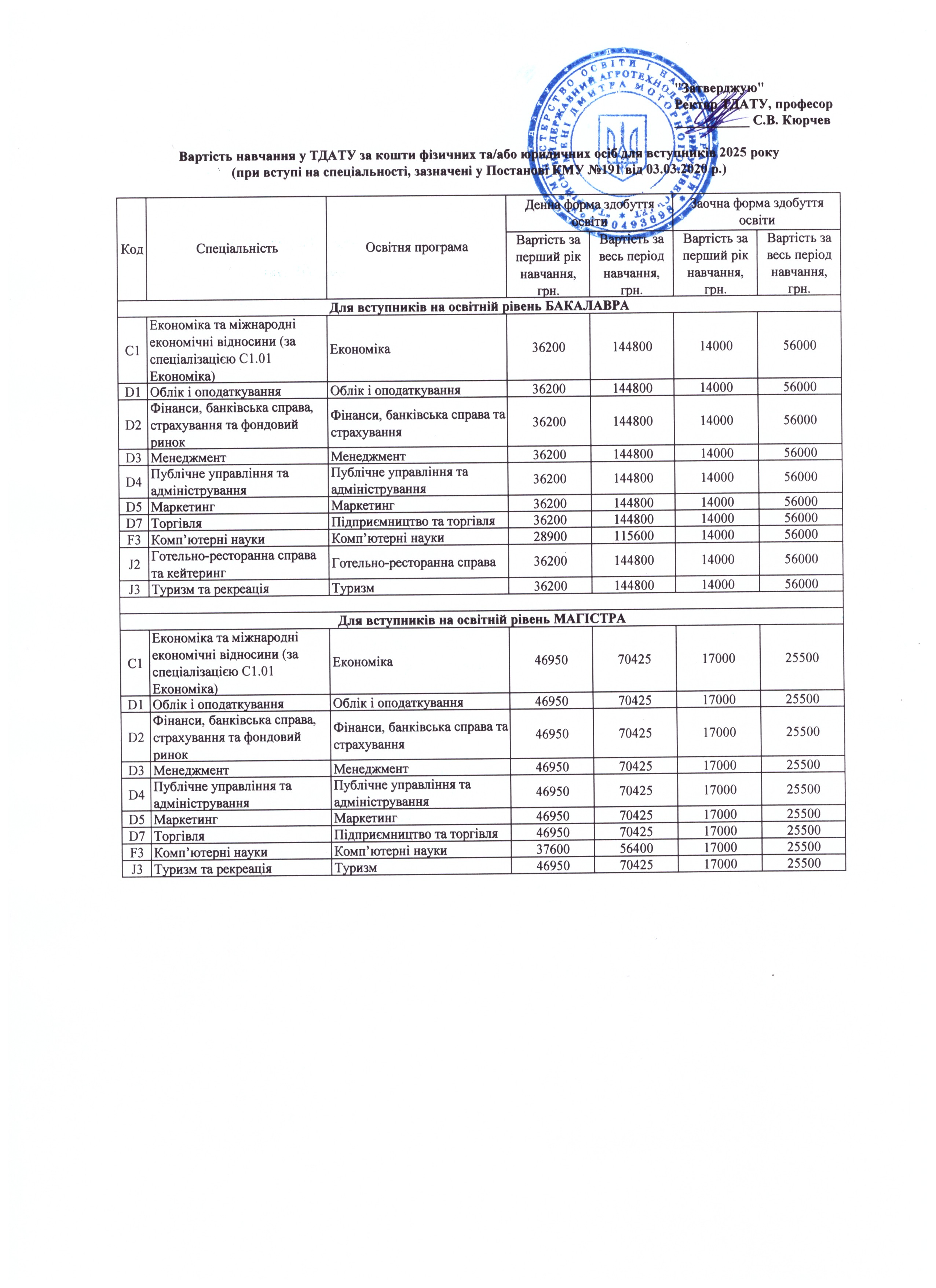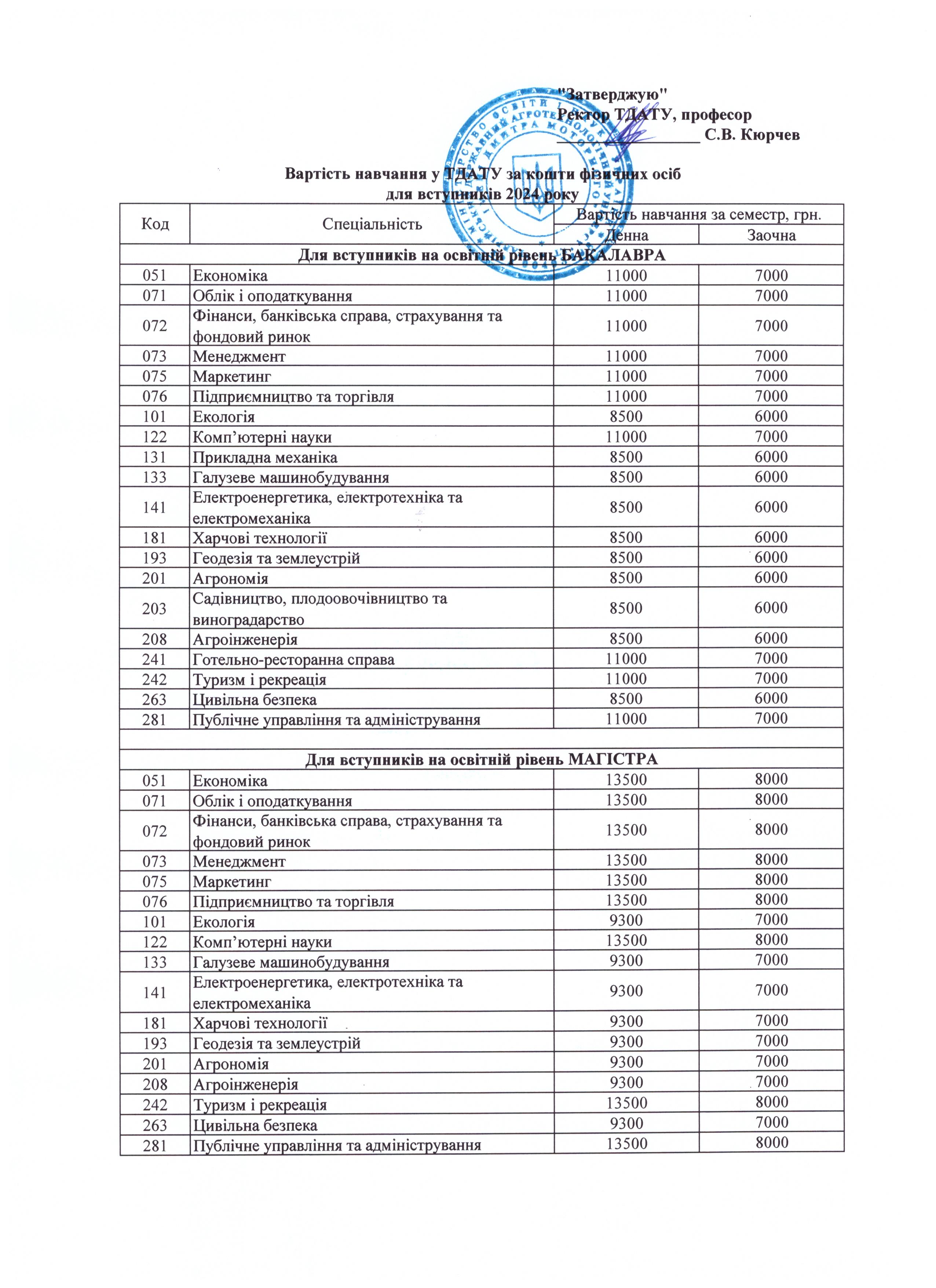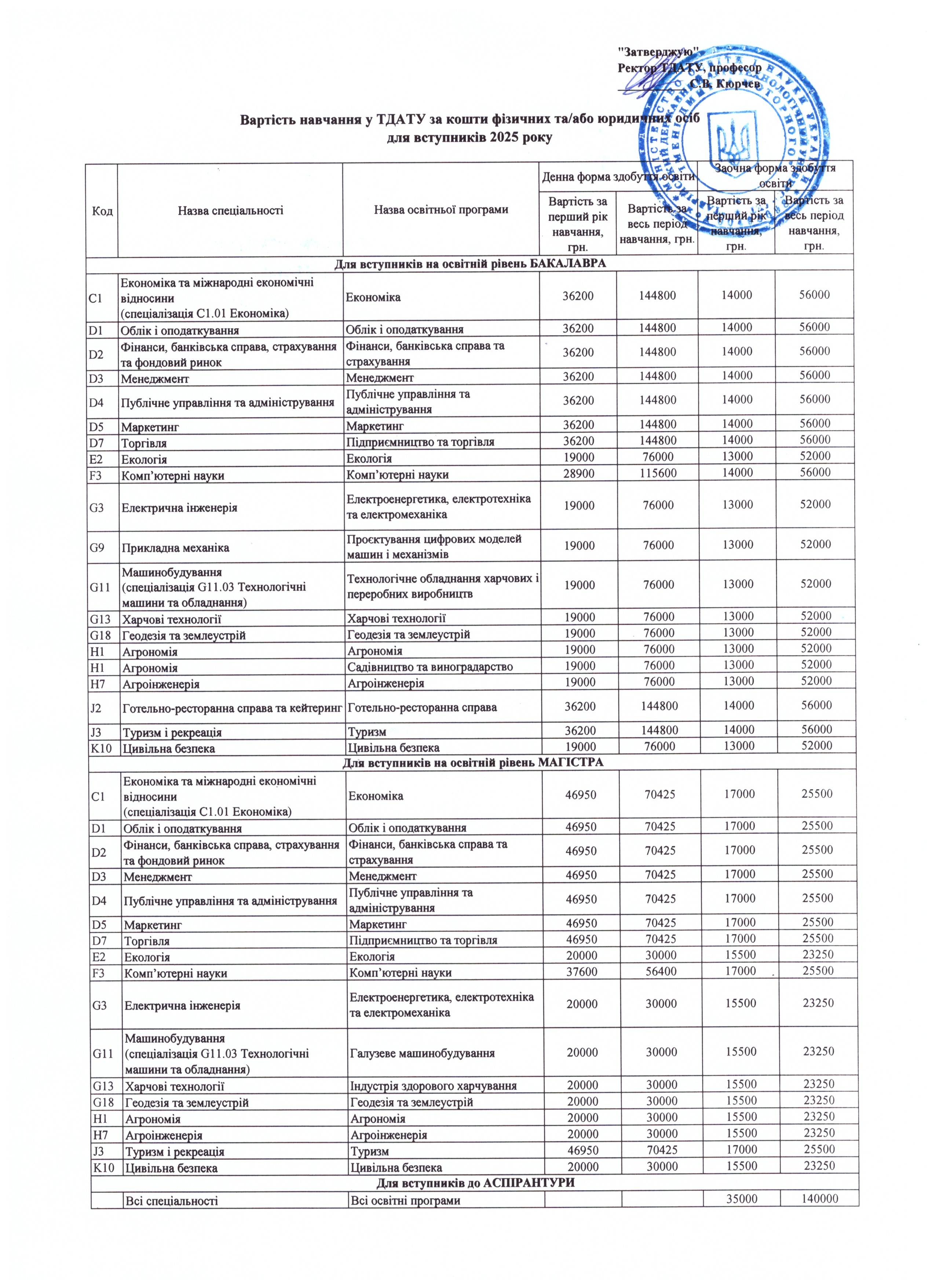 Вартість навчання в ТДАТУ для вступників 2025 року