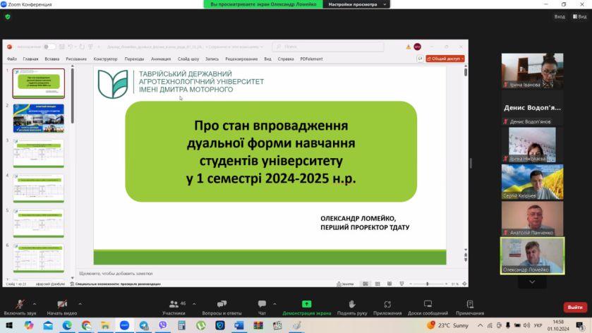 Перший проректор Університету Олександр Ломейко доповідав щодо впровадження дуальної форми навчання студентів університету у І семестрі 2024-2025 н.р. Дуальна форма навчання успішно реалізується у ТДАТУ з 2014 року, коли студенти окрім теоретичних занять засвоюють та застосовують свої знання на виробництві. Олександр Петрович зробив акцент на зміні географії підприємств-партнерів: якщо до повномасштабної війни це, в основному були місцеві підприємства, то зараз до співпраці поступово вдалося залучити партнерів з інших регіонів.