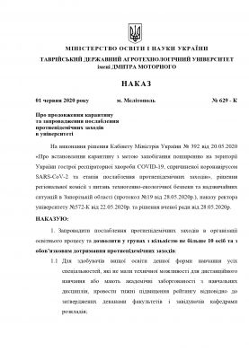 На виконання рішення Кабінету Міністрів України № 392 від 20.05.2020 «Про встановлення карантину з метою запобігання поширенню на території України гострої респіраторної хвороби COVID-19, спричиненої коронавірусом SARS-CoV-2 та етапів послаблення протиепідемічних заходів», рішення регіональної комісії з питань техногенно-екологічної безпеки та надзвичайних ситуацій в Запорізькій області(протокол №19 від 28.05.2020р.), наказу ректора університету №572-К від 22.05.2020р. та рішення вченої ради від 28.05.2020р.