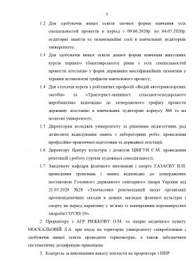 2. Проректору з АГР РИЖКОВУ О.М. та лікарю медичного пункту МОСКАЛЬОВІЙ Л.А. при вході на територію університету співробітників і здобувачів вищої освіти проводити термометрію, а також забезпечити систематичну дезінфекцію приміщень.