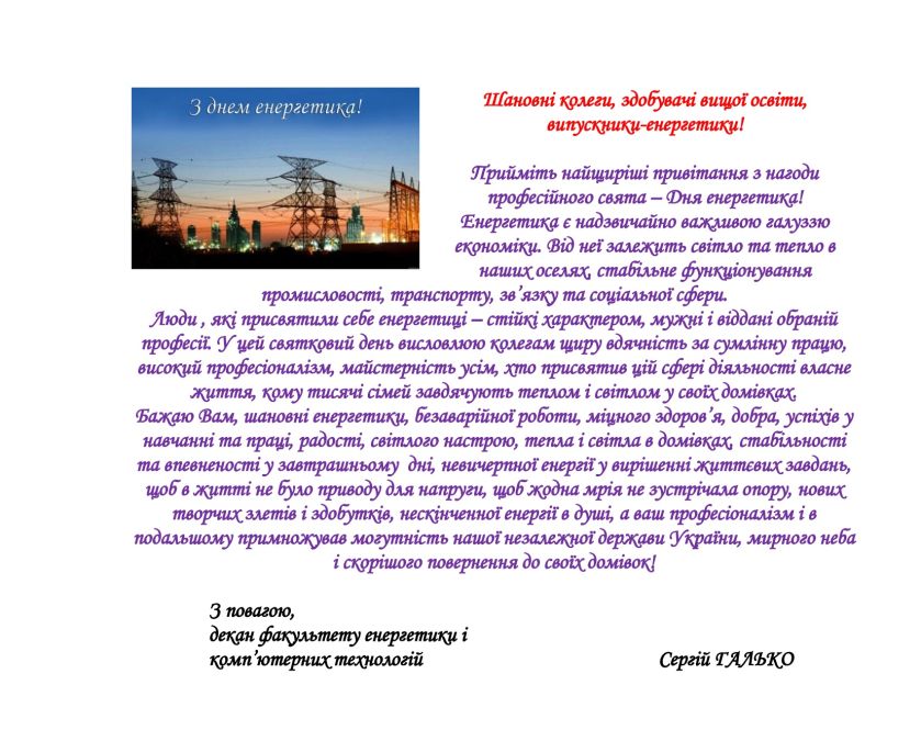 Вітання ректора з Днем енергетика та Днем народження факультету ЕКТ