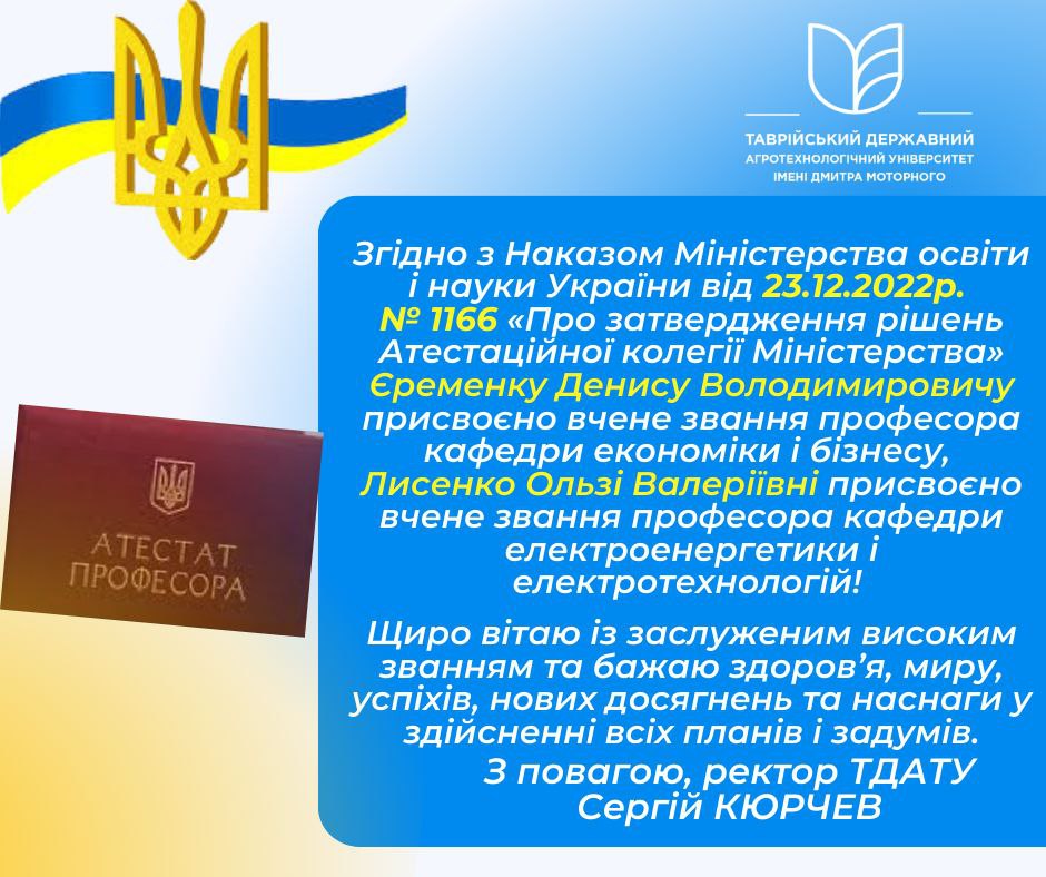 Ректор вітає науковців ТДАТУ з отриманням вченого звання професора