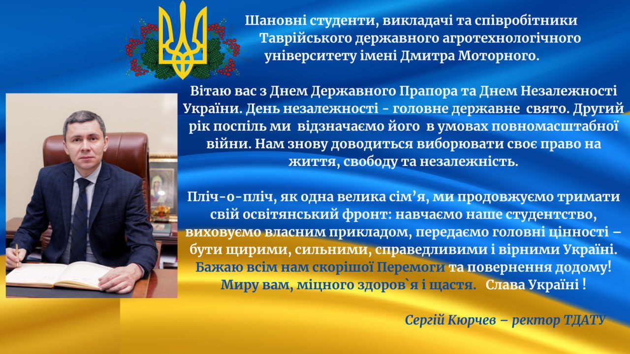 Привітання ректора ТДАТУ Сергія Кюрчева з Днем Державного Прапора та Днем Незалежності України