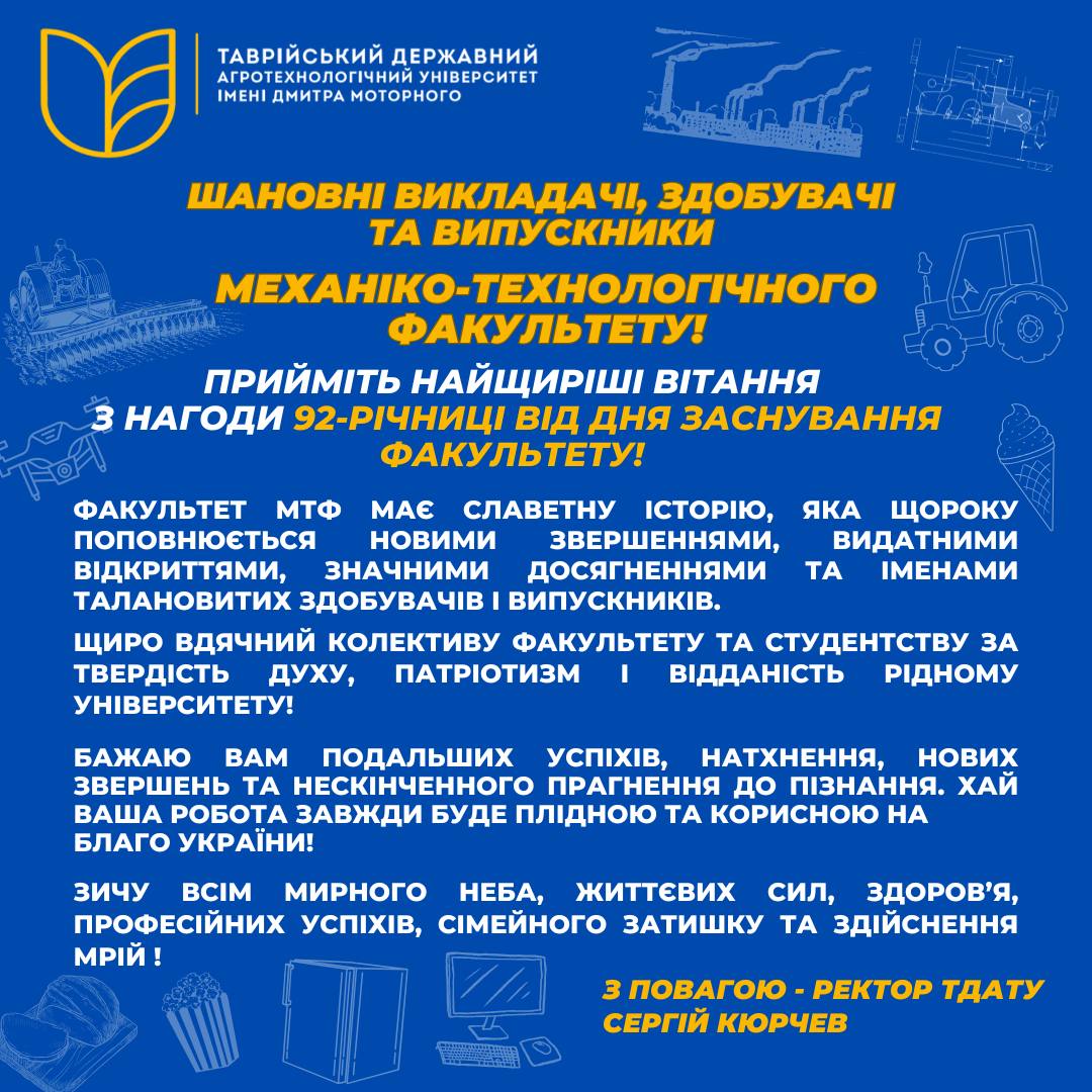 Привітання ректора ТДАТУ з 92-ю річницею від Дня заснування механіко-технологічного факультету
