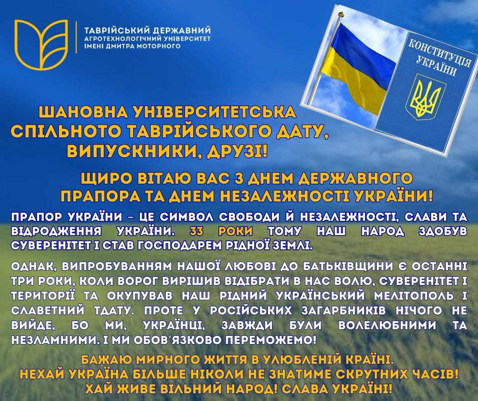 Привітання ректора ТДАТУ з Днем Державного Прапора та Днем Незалежності України