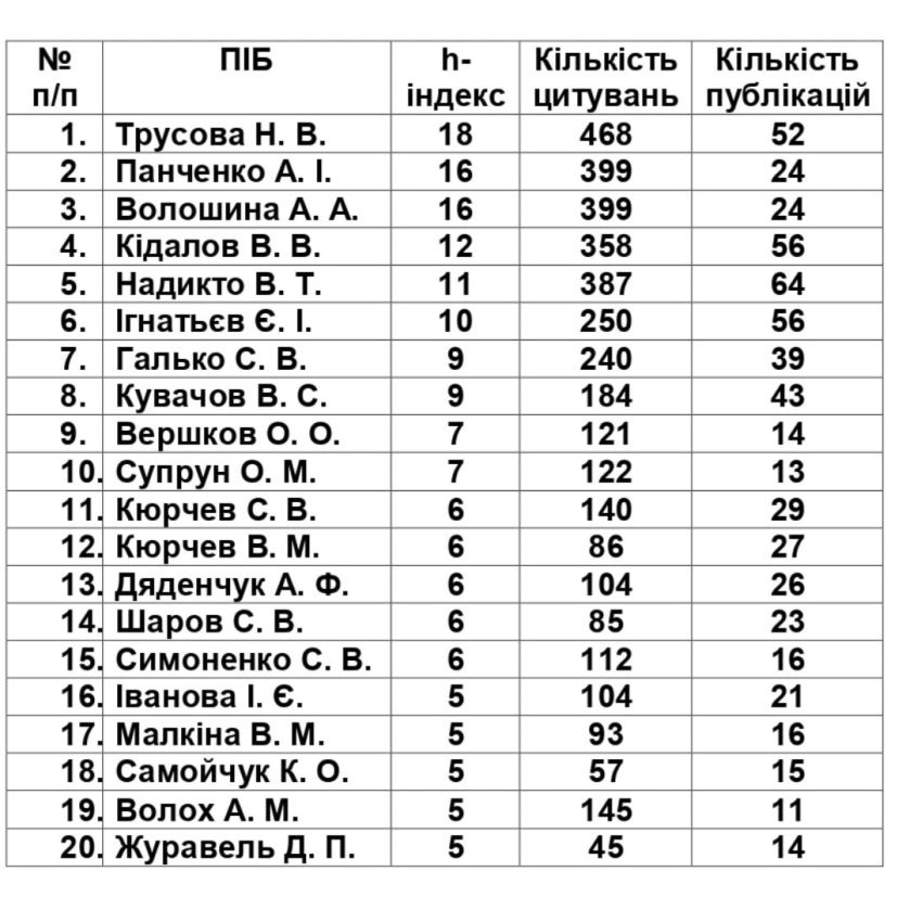 ТОП-20 вчених ТДАТУ за індексом Гірша у SCOPUS
