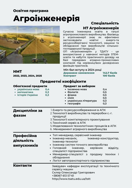 Таврійський державний агротехнологічний університет імені Дмитра Моторного пропонує здобути вищу освіту за спеціальністю Н7 «АГРОІНЖЕНЕРІЯ».