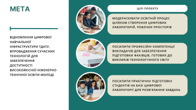 Метою проєкту DigiTech є відновлення цифрової навчальної інфраструктури ТДАТУ, впровадження сучасних технологій для забезпечення доступності високоякісної інженерно-технічної освіти молоді.