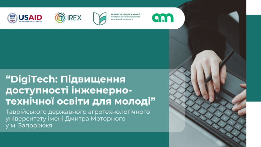 У Таврійському державному агротехнологічному університеті імені Дмитра Моторного розпочато реалізацію проєкту “DigiTech: Підвищення доступності інженерно-технічної освіти для молоді” спільно з Інформаційно-консультаційним центром “Агро-Таврія” в межах програми “Мріємо та діємо”, яка впроваджується за фінансової підтримки Агентства США з міжнародного розвитку (USAID) та виконується IREX.