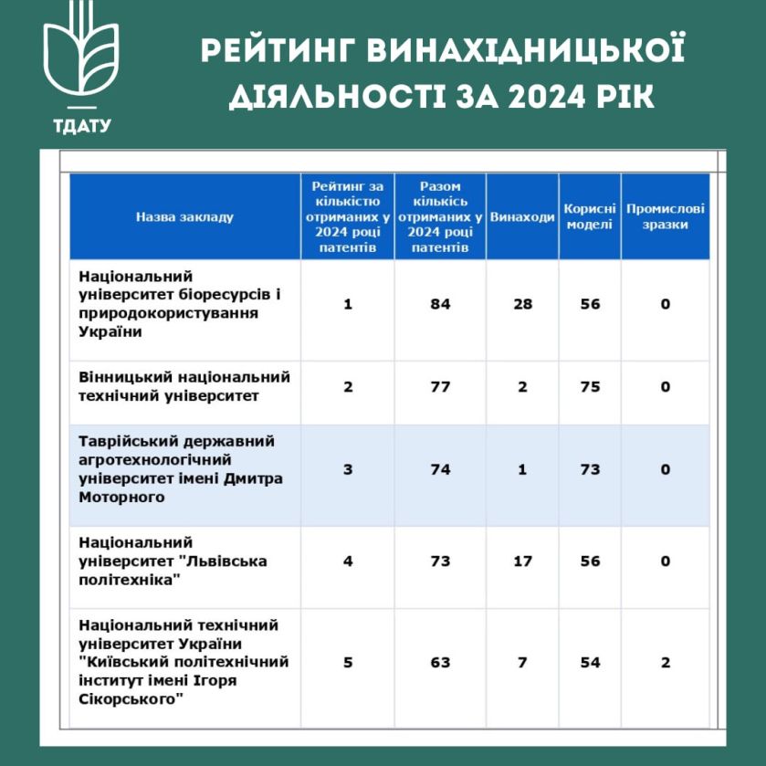 За підсумками рейтингу Таврійський державний агротехнологічний університет імені Дмитра Моторного посів 4 позицію рейтингу серед ЗВО України і впевнено повертає багаторічні позиції лідера винахідницької діяльності.