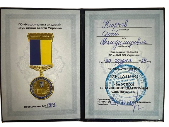 За підсумками роботи академіків ГО «Національна академія наук вищої освіти України» у 2024 році, ректора ТДАТУ, доктора наук, професора, академіка НАН ВО Сергія Кюрчева відзначено медаллю «За успіхи в науково-педагогічній діяльності».