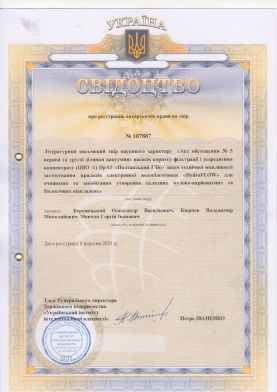 5. Свідоцтво про реєстрацію авторського права на твір №107887. Дата реєстрації 17 серпня 2021 р. №с202185869. Літературний письмовий твір наукового характеру «Акт обстеження № 5 першої та другої лінії ділянки вакуумних насосів корпусу фільтрації і усереднення концентрату (ЦВО – 1) ПрАТ «Полтавський ГЗК» щодо технічної можливості застосування приладів електронної водопідготовки «HydroFLOW» для очищення та запобігання утворення сульфатно-карбонатних відкладень / О.В.Бережецький., В.М.Кюрчев, С.І. Мовчан // Ідентифікатор: СR152080921. https://sis.ukrpatent.org
