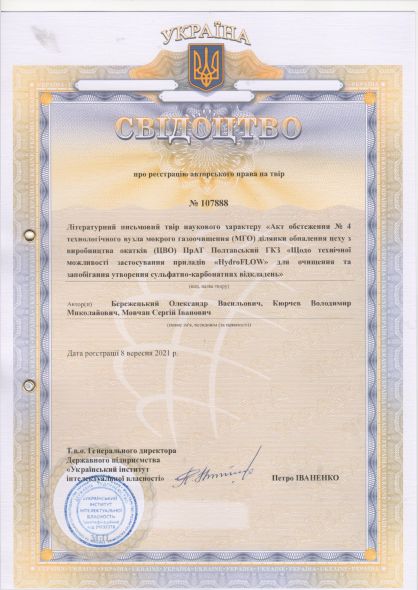 6. Свідоцтво про реєстрацію авторського права на твір №107888. Дата реєстрації 17 серпня 2021 р. №с202185872. Літературний письмовий твір наукового характеру «Акт обстеження № 4 технологічного вузла мокрого газоочищення (МГО) ділянки обпалення цеху з виробництва окатків (ЦВО) ПрАТ «Полтавський ГЗК» «Щодо технічної можливості застосування приладів електронної водопідготовки «HydroFLOW» для очищення та запобігання утворення сульфатно-карбонатних відкладень/ О.В.Бережецький., В.М. Кюрчев, С.І. Мовчан // Ідентифікатор: СR152080921. https://sis.ukrpatent.org