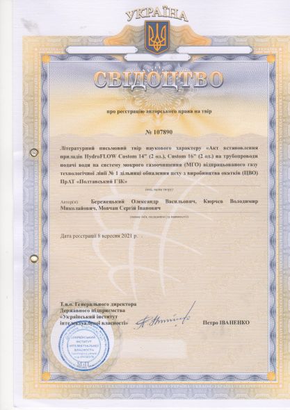 8. Свідоцтво про реєстрацію авторського права на твір №107890. Дата реєстрації 17 серпня 2021 р. №с202185875. Літературний письмовий твір наукового характеру «Акт встановлення Приладів HydroFLOW Custrom 14!! (2од.), Custrom 16!! (2од.), на трубопроводи подачі води в систему мокрого газоочищення (МГО) відпрацьованого газу технологічної лінії №1 дільниці обпалення цеху з виробництва окатів (ЦВО) ПрАТ «Полтавський ГЗК» / О.В.Бережецький., В.М. Кюрчев, С.І. Мовчан // Ідентифікатор: СR152080921. https://sis.ukrpatent.org