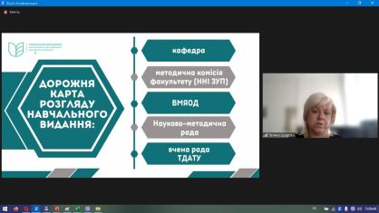 Для полегшення процесу проходження процедурних моментів присутнім було запропоновано розроблений співробітниками ННЦ алгоритм дій – від етапу планування до отримання грифу Вченої ради ТДАТУ. Цей алгоритм візуально відображає основні пункти Положення про порядок надання грифу Вченої ради навчальним виданням Таврійського державного агротехнологічного університету імені Дмитра Моторного.