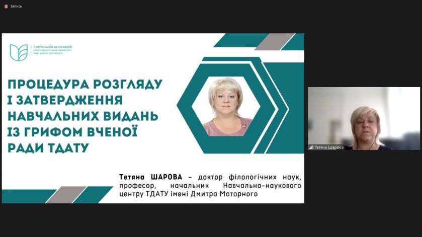 Для полегшення процесу проходження процедурних моментів присутнім було запропоновано розроблений співробітниками ННЦ алгоритм дій – від етапу планування до отримання грифу Вченої ради ТДАТУ. Цей алгоритм візуально відображає основні пункти Положення про порядок надання грифу Вченої ради навчальним виданням Таврійського державного агротехнологічного університету імені Дмитра Моторного.