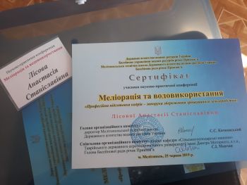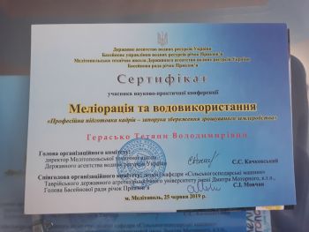 25.06.2019 у Мелітопольській технічній школі Державного агентства водних ресурсів (МТШ ДАВР) відбулася ІХ науково-практична конференція «Меліорація та водопостачання: професійна підготовка – запорука збереження зрошуваного землеробства». У роботі конференції взяли участь представники кафедри «Плодоовочівництва, виноградарства та біохімії» ТДАТУ імені Дмитра Моторного– доцент Герасько Т.В. та студентка 21 АГ Лісова А.С.