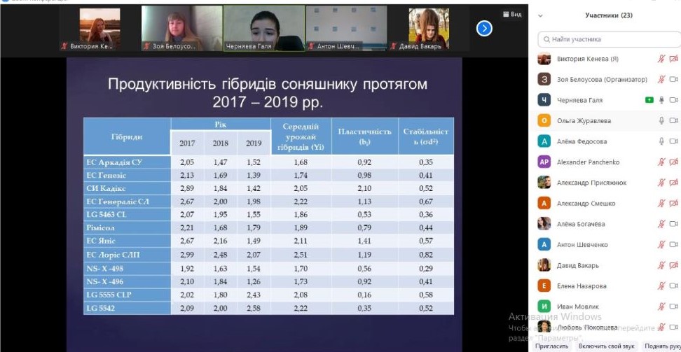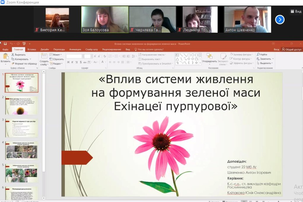 12 листопада 2020 року відбулась VII Всеукраїнська науково-технічна конференція магістрантів і студентів за підсумками наукових досліджень 2020 року (секція Рослинництво) за допомогою платформи Zoom. Голова: к.с.-г.н. Білоусова З.В., секретар: Семенова К.О., 11 МБ АГ. В конференції взяли участь магістри 1-го та 2-го року навчання спеціальності «Агрономія».