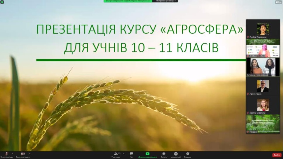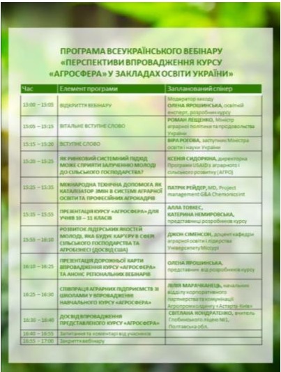 Загальною метою Всеукраїнського вебінару є обговорення ідеї можливості започаткування аграрного профілю в середній профільній освіті, інформування освітян України про розробку й апробацію авторської програми та навчального посібника «Агросфера» для учнів 10-11 класів, презентація дорожньої карти впровадження курсу «Агросфера» з 2022 року у закладах освіти України.