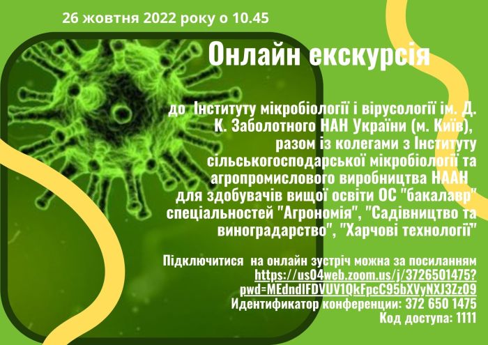 Кафедра рослинництва та садівництва запрошує на онлайн-екскурсію до Інституту мікробіології 20.10.2022