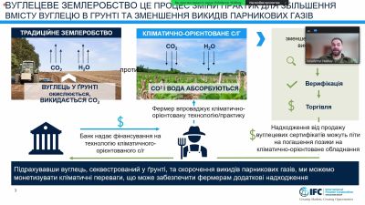 Також були представлені основні моделі підрахунку вуглецевого сліду в сільському господарству, ринки вуглецевих сертифікатів та як фермери можуть генерувати додатковий дохід, додаткові можливості продажу декарбонізованої продукції сільського господарства.