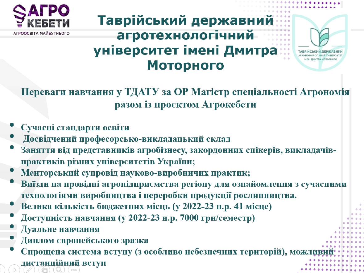 На заході абітурієнти дізналися про особливості проєкту «Агрокебети», як вступити на магістратуру цього року. Доцент кафедри рослинництва і садівництва імені професора В.В.Калитки Любов ПОКОПЦЕВА ознайомила з особливостями підготовки магістрів за спеціальністю Агрономія у ТДАТУ та освітила основні переваги навчання.