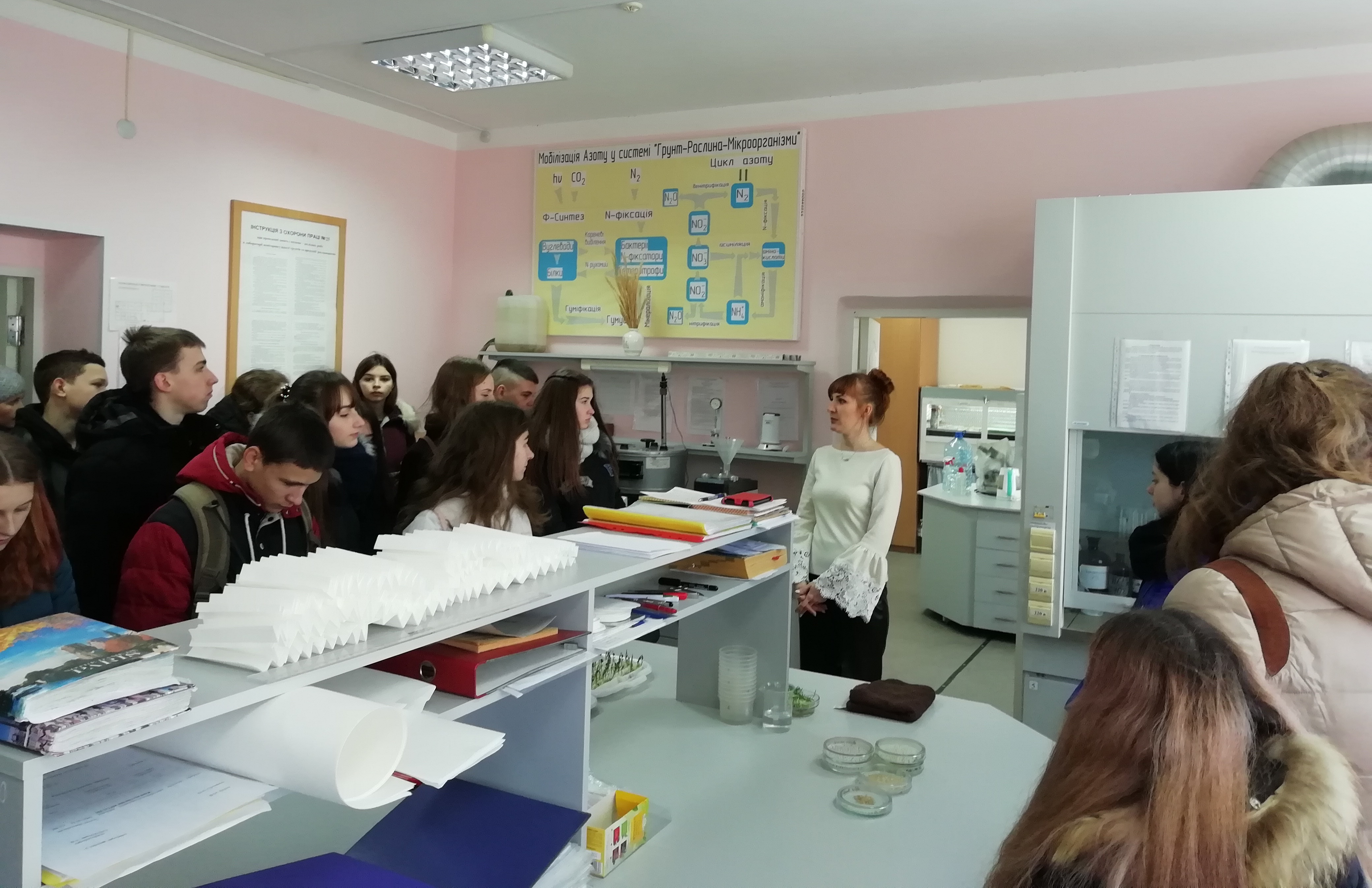 Асистент, майстер виробничого навчання кафедри технічного сервісу та систем в АПК Григоренко С. М. розповів та показав лабораторію з вирощування перепілок, асистент кафедри рослинництва ім. Калитки В. В. – Федосова А.О. ознайомила з роботою лабораторії моніторингу якості ґрунтів та продукції рослинництва. В холі корпусу учні ознайомились з колекцією ґрунтів Південного Степу України.