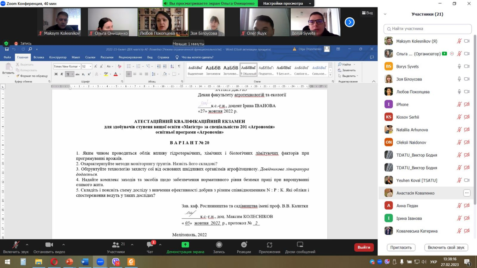 27 і 28 лютого 2023 року у ТДАТУ на базі кафедри рослинництва і садівництва імені професора В.В. Калитки був проведений державний атестаційний кваліфікаційний екзамен для здобувачів вищої освіти за освітнім ступенем «Магістр» спеціальності «Агрономія» факультету агротехнологій і екології.