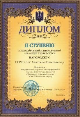 За результатами конкурсу Диплом ІІ ступеня отримала робота магістрів спеціальності Агрономія Віхляєвої Анастасії та Сергеевої Анастасії на тему “Продуктивність сортів картоплі в умовах півдня України при краплинному зрошенні” (керівник, к.с.г.н., доцент Малюк Т.В.).