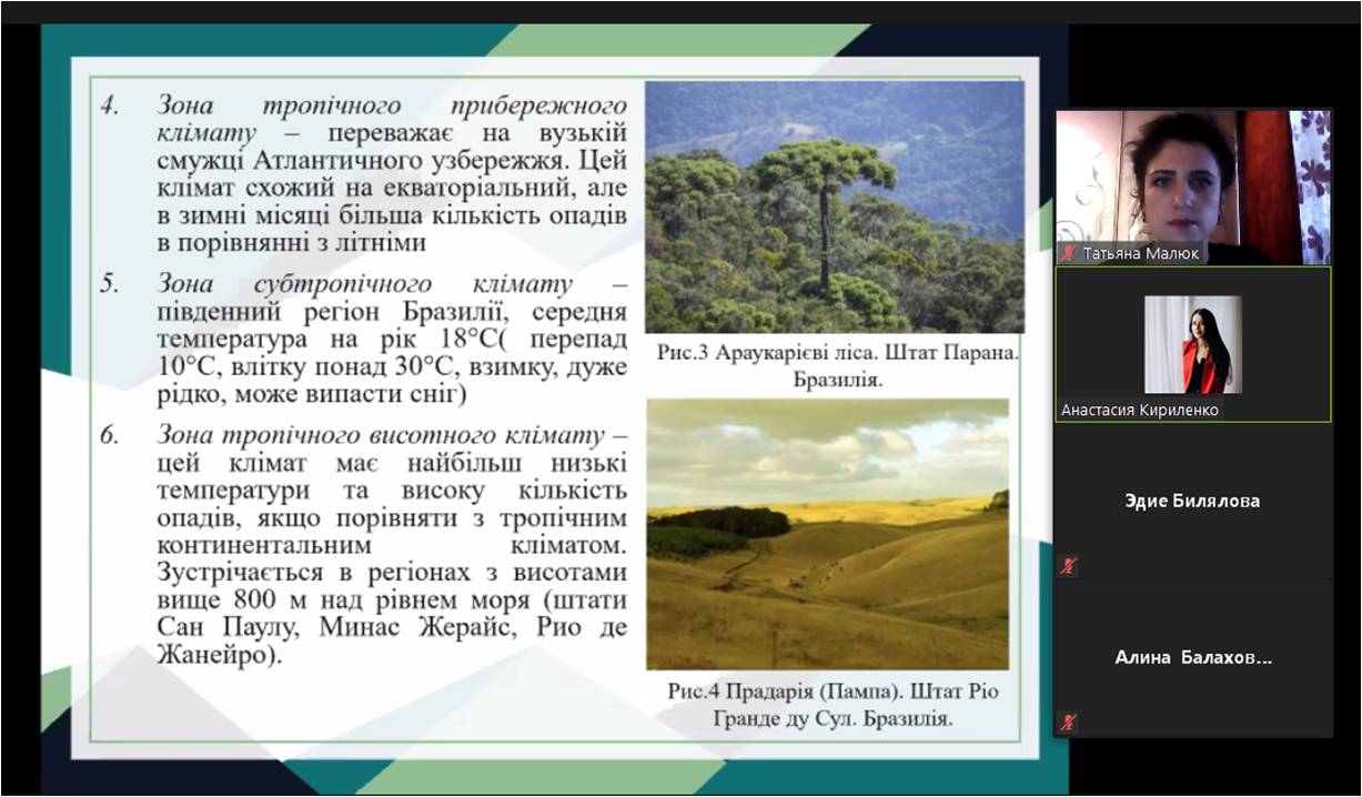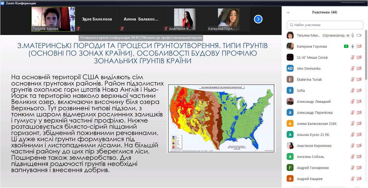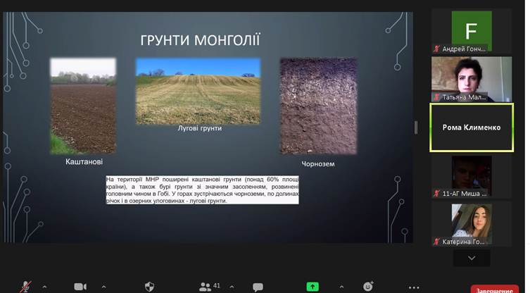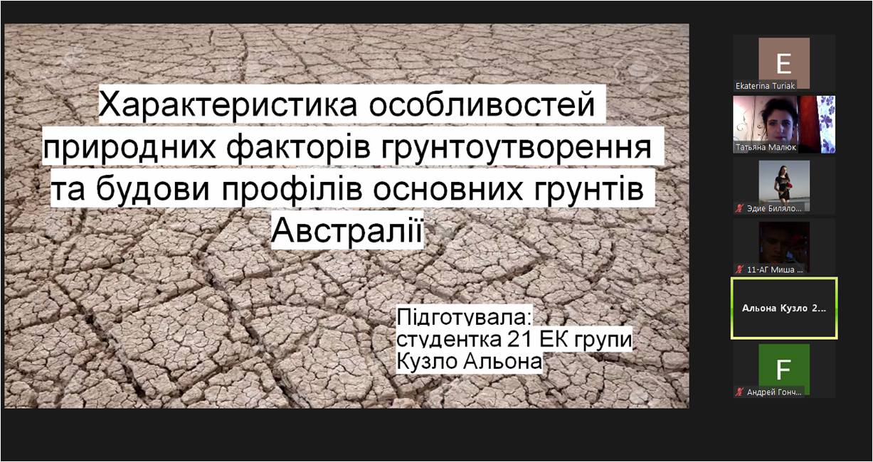Наступним пунктом була Австралія, куди нас перенесли Кузло Альона та Денченко Вадим, і ознайомили всіх з розмаїттям ґрунтового покриву найменшого і такого незвіданого для нас континенту – Австралії. Кириленко Настя запросила до подорожі за океан – її доповідь була про фактори ґрунтоутворення та особливості ґрунтів Бразилії. У Мексиці ми побували разом з Біляловою Едіє. Північну Америку, а саме США, ми відвідали завдяки Горловій Катерині. До посушливого Казахстану запросила Балаховська Аліна, з розмаїттям ґрунтів Росії ознайомив Левадній Олександр. Подорож закінчилася в Азії. Монголія розкрила для нас свої ґрунтові таємниці разом з Клименко Романом.