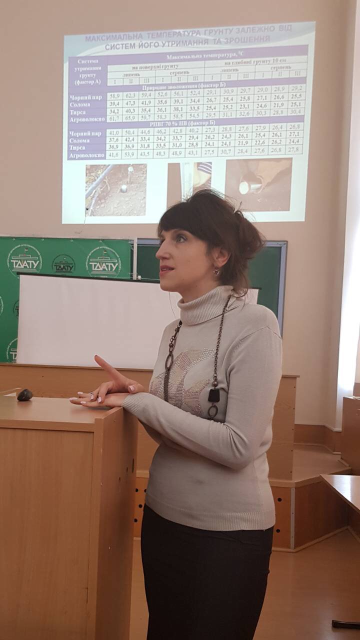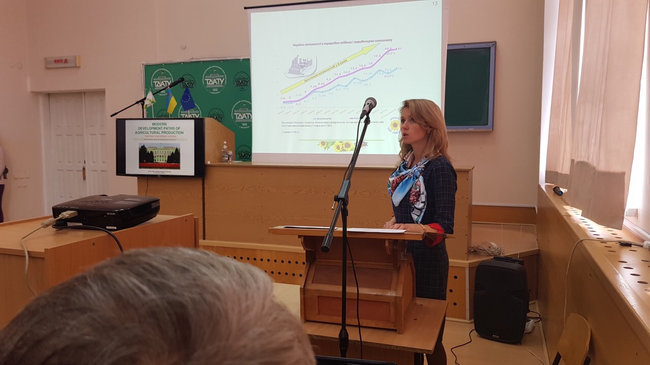 Викладачі та студенти кафедри рослинництва імені професора В.В. Калитки приймали активну участь у роботі Міжнародної науково-практичної конференції «Modern development pathes of agricultural» (23-24 жовтня 2018 р., Tavria State Agrotechnological University). На пленарному засіданні виступила завідувач кафедри, доцент, кандидат сільськогосподарських наук Єременко О.А. з доповіддю “The promising trends of production and processing of sunflower seeds in Ukraine”. Під час доповіді Оксана Анатоліївна звернула увагу присутніх на сучасну та актуальну проблему виробництва та переробки насіння соняшнику як в Україні, так і у світі в цілому.