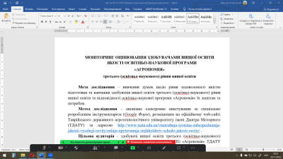 Також, будо проведено опитування та обговорення з метою вивчення думок щодо рівня задоволеності якістю підготовки та навчання здобувачів вищої освіти третього (освітньо-наукового) рівня вищої освіти та відповідності освітньо-наукової програми «Агрономія» їх запитам та потребам.