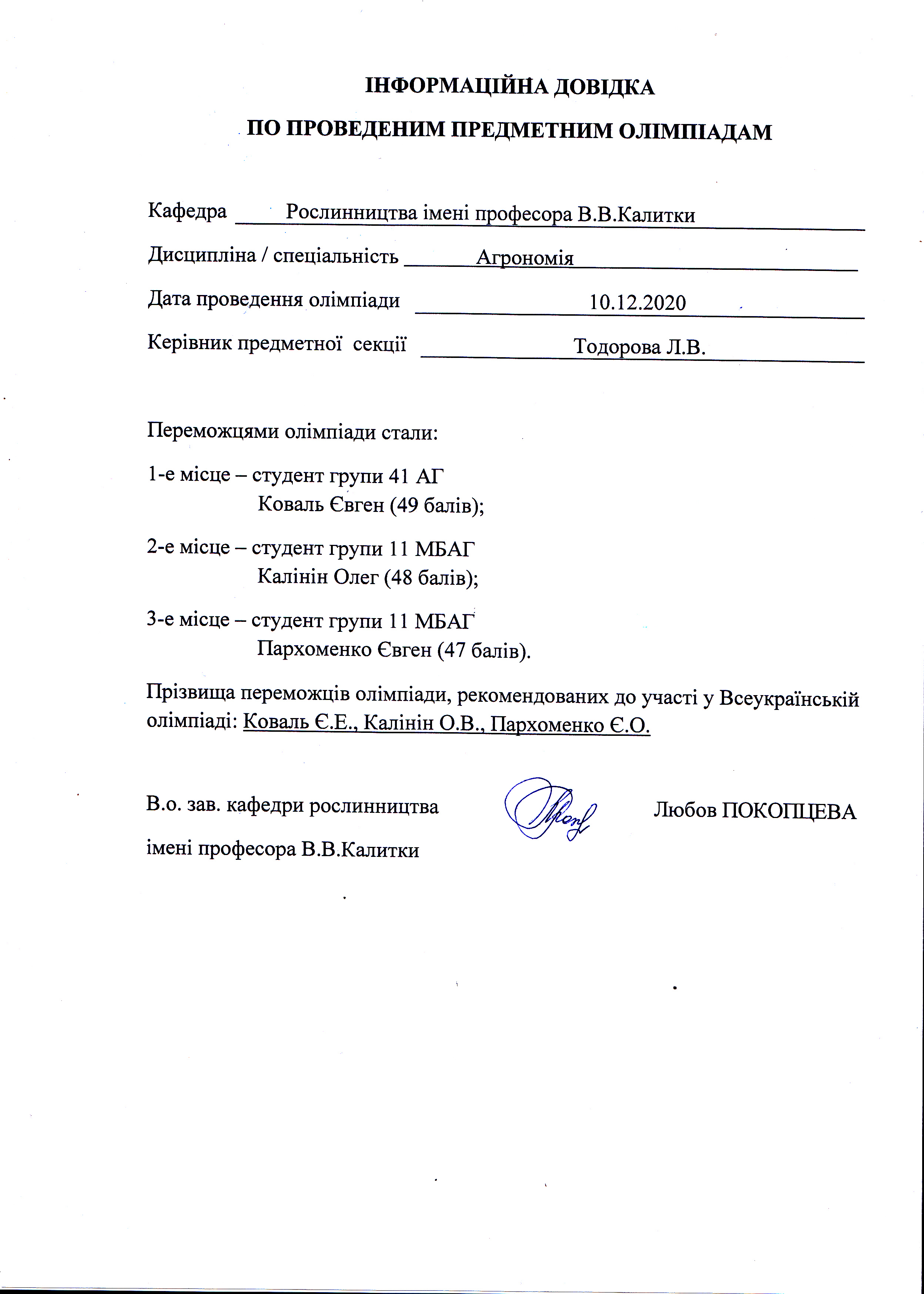 Олімпіада з “Агрономії” 2021-2022 навчальний рік Інформаційна довідка по проведенню олімпіади з дисциплін “Агрономія” Протокол проведення олімпіади з дисциплін “Агрономія” 2020-2021 навчальний рік Інформаційна довідка по проведенню олімпіади з дисциплін “Агрономія” Протокол проведення олімпіади з дисциплін “Агрономія”