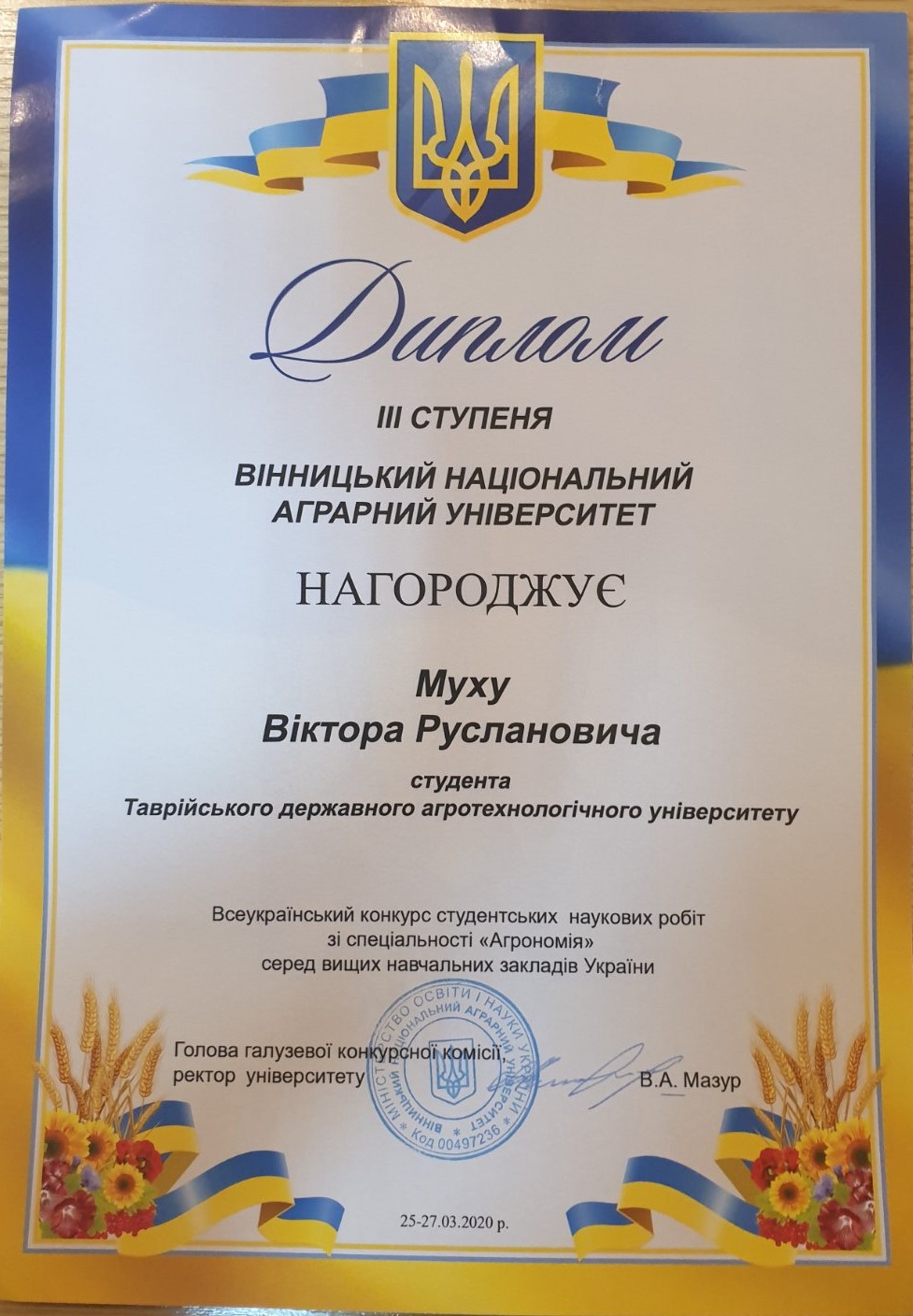 Студент Муха В.Р. за свою роботу був нагороджений дипломом ІІІ ступеня у Всеукраїнському конкурсі студентських наукових робіт зі спеціальності «Агрономія» серед вищих навчальних закладів України.