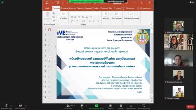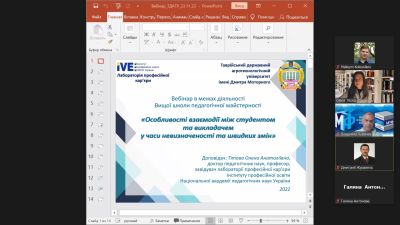 23 листопада 2022 року викладачі кафедри рослинництва та садівництва прийняли участь у вебінарі «Особливості взаємодії між студентом та викладачем у часи невизначеності та швидких змін», що був організований в межах діяльності Вищої школи педагогічної майстерності ТДАТУ.