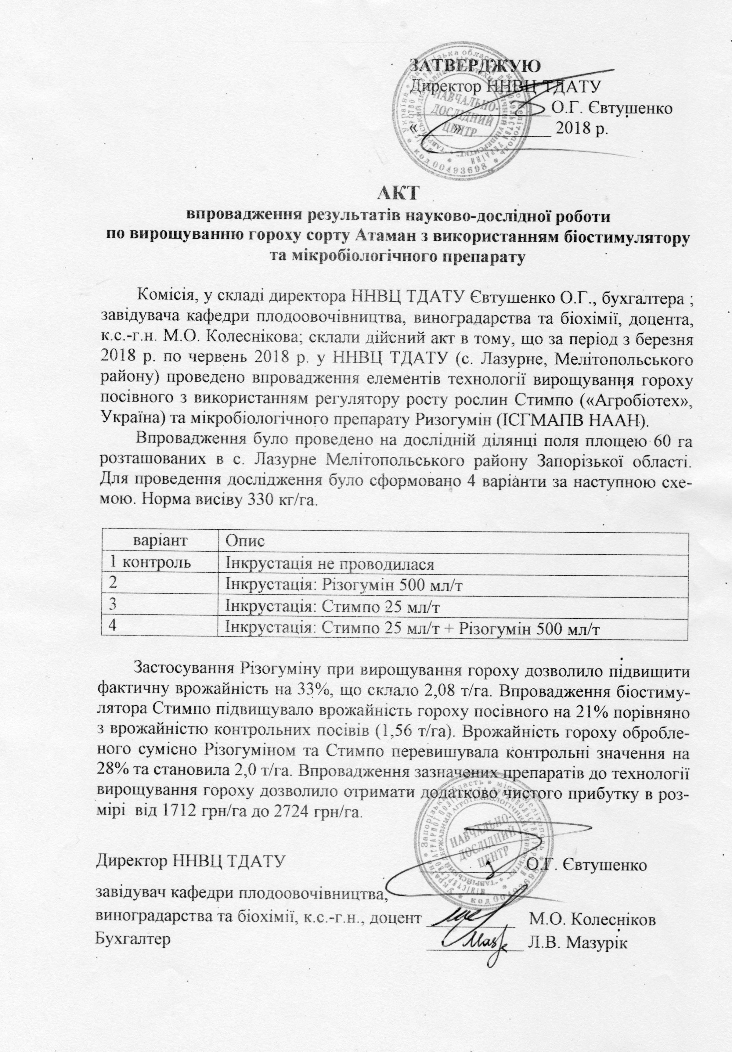 Договір про апробацію результатів наукових досліджень між ТДАТУ та ФГ “Атаман”