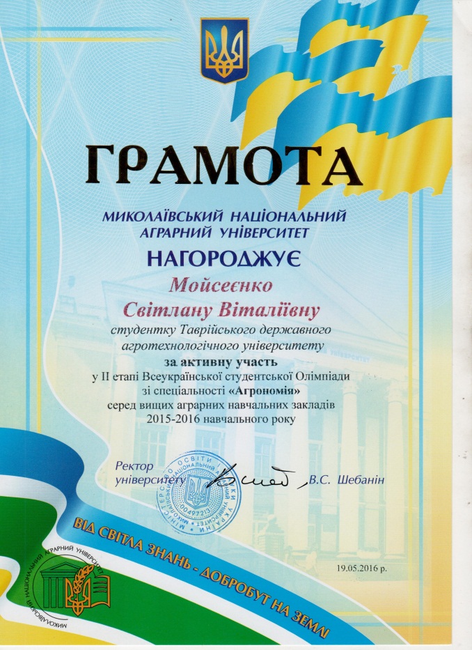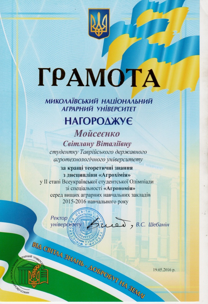 За творчий підхід до виконання теоретичних завдань, глибокі, повні та аргументовані відповіді представник ТДАТУ був нагороджений грамотою за кращі теоретичні знання з дисципліни «Агрохімія».