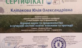 В період з 2 серпня по 10 вересня 2021 року старший викладач кафедри рослинництва імені професора В.В. Калитки Кліпакова Ю.О. брала участь у науково-педагогічному підвищенні кваліфікації у галузі аграрних наук та продовольства «Аграрні науки та продовольство в сучасній системі освіти: взаємини та протидії». Програма стажування включала модулі, які були присвячені підготовці фахівців у галузі аграрних […]