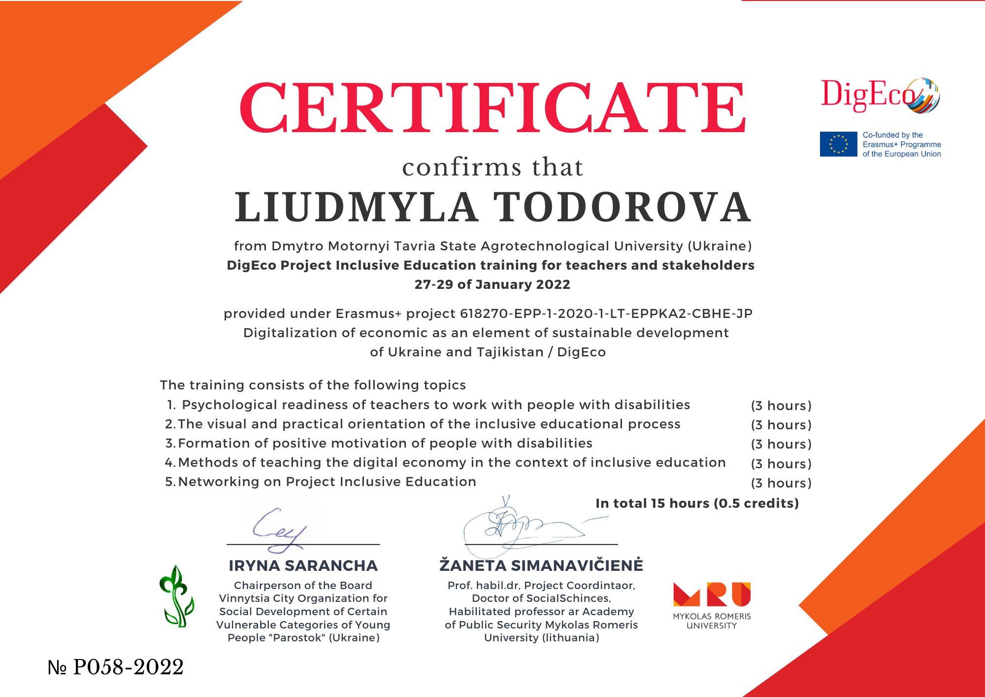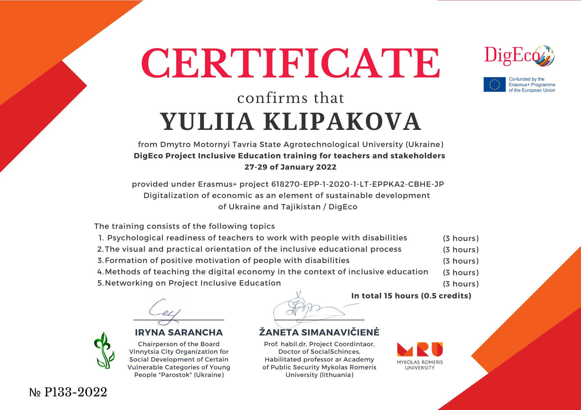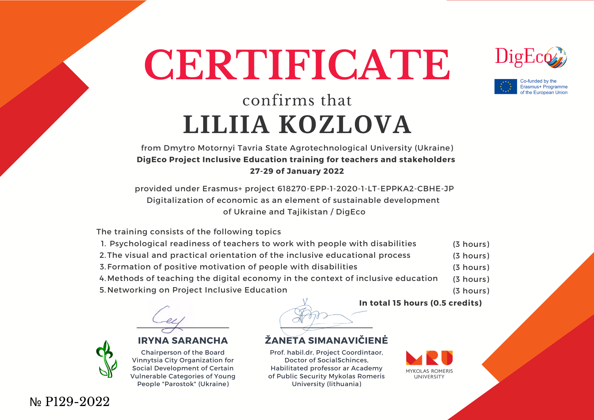 27-29 січня 2022 року на платформі Zoom проходив тренінг з інклюзивної освіти DigEco Projekt, в якому взяли участь викладачі кафедри рослинництва імені професора В.В. Калитки. Також до тренінгу долучилося близько 100 зареєстрованих учасників, зацікавлених у реалізації та діяльності проєкту Діджиталізація економіки як елемент сталого розвитку України та Таджикистану(DigEco).