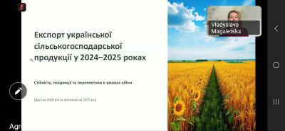 3 квітня 2025 року викладачі кафедри рослинництва та садівництва імені професора В.В.Калитки та здобувачі вищої освіти спеціальностей Агрономія та Садівництво та виноградарство відвідали відкриту онлайн лекцію «Розвиток та перспективи українського аграрного експорту» спікером якої була радник Міністра Аграрної Політики та продовольства України Владислава Магалецька. Захід відбувся за підтримки проєкту Агрокебети.