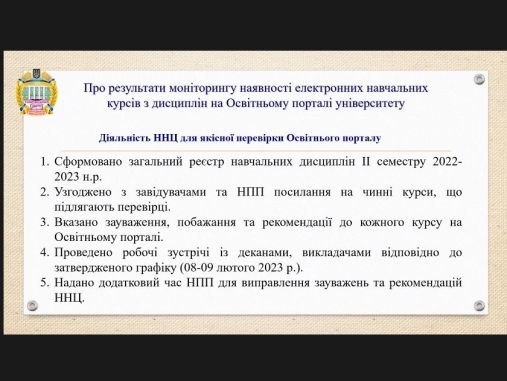 Начальник навчально-наукового центру Тетяна Шарова презентувала результати моніторингу наявності електронних навчальних курсів з дисциплін на Освітньому порталі університету. Було визначено, що перевірка проводилась у кілька етапів, було переглянуто 758 курсів на всіх факультетах. Наголошено, що тільки тісна співпраця ННЦ з деканами, завідувачами кафедр, головами методичних комісій дозволила максимально швидко наповнити електронні навчальні курси відповідно до нормативних вимог та забезпечити якісний освітній процес.